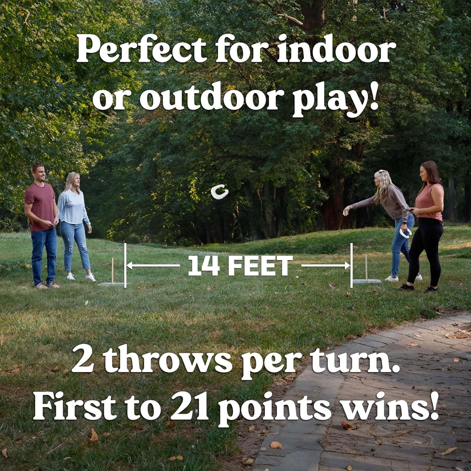 Includes 2 all-wood game boards with 14” wood posts, 4 team-colored horseshoe bags, bag carrying case