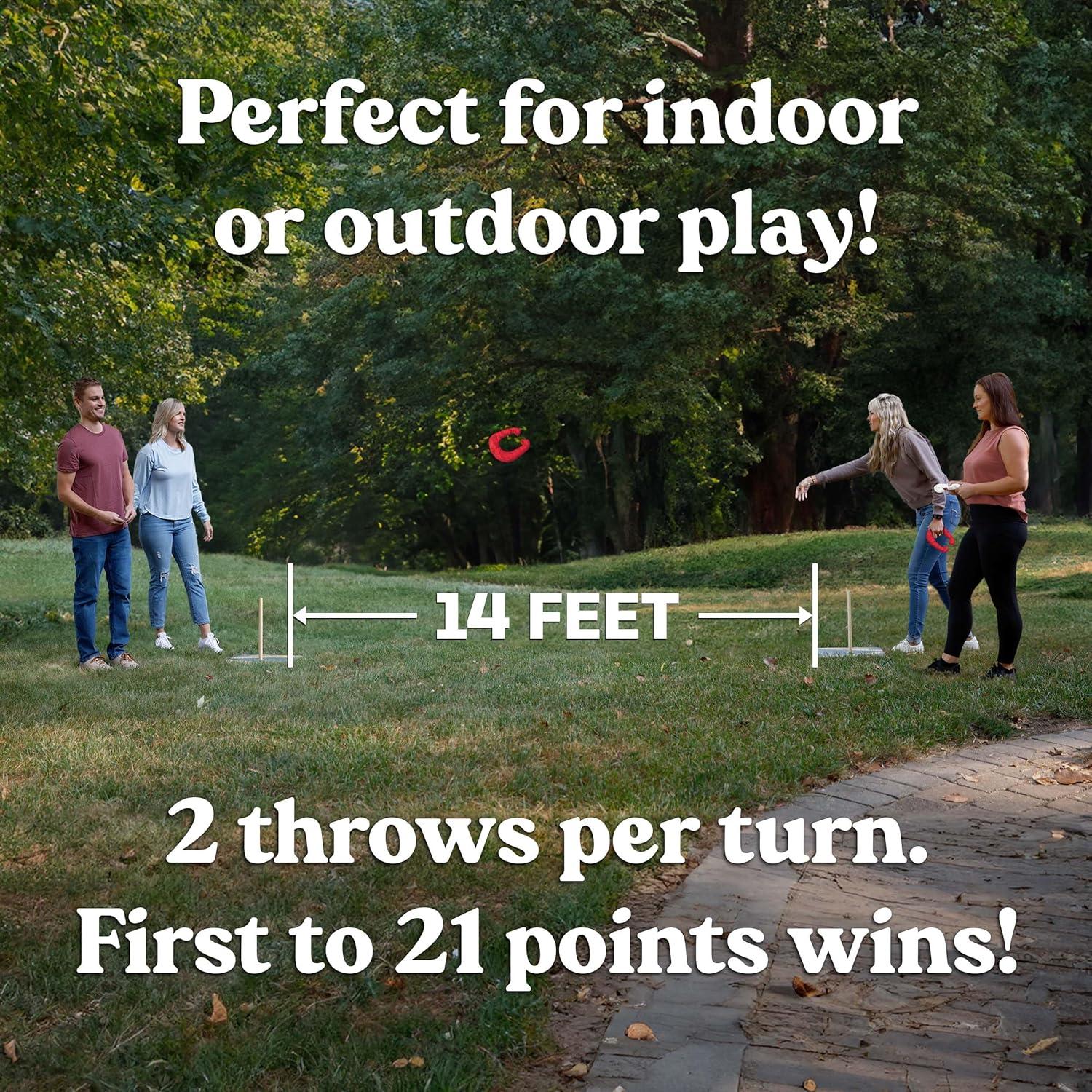 Includes 2 all-wood game boards with 14” wood posts, 4 team-colored horseshoe bags, bag carrying case
